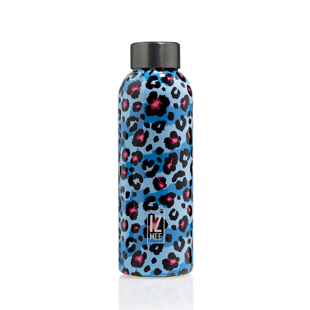 Izmee - Thermal bottle for liquids, fantastic leopard print on a light blue background. Never again without the Izmee steel bottle, cheerful, colorful and practical. Put it in your nice bag, and take it with you to work, to school, to the cinema, on vacation! Hydrate in style.