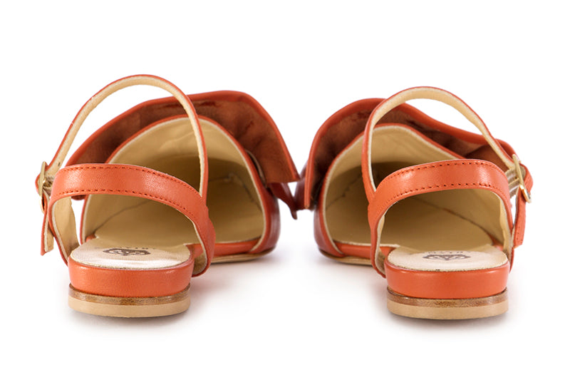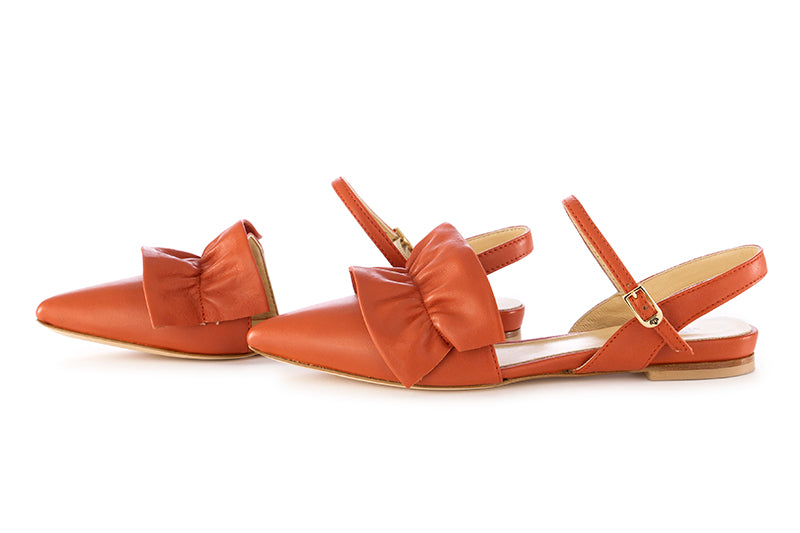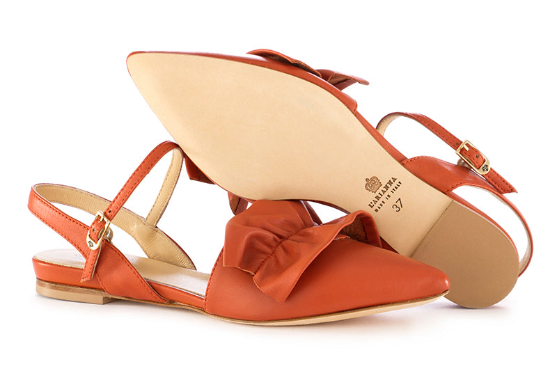 L'Arianna - Flat pointed toe sandals in orange leather, with nice ruffles on the upper, lined in leather and with a leather sole. Romantic and bon ton, match them with your outfits at work and in your free time, color, design, and quality made in Italy, you can't go wrong.