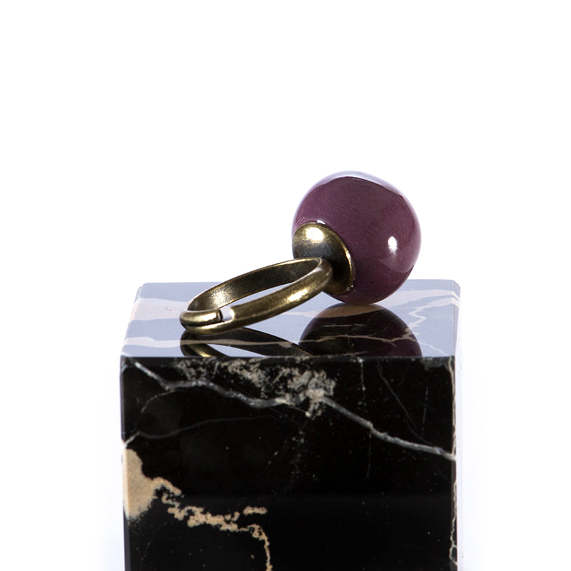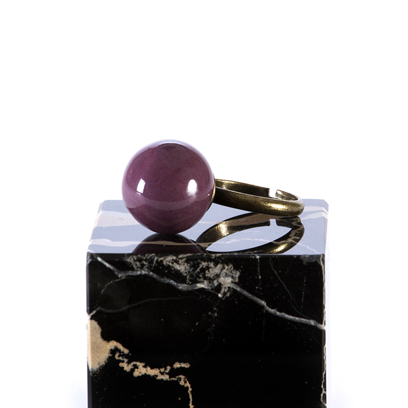 Tolemaide - Ring in antiqued brass, adjustable, with ceramic sphere glazed in powder purple, handmade in Italy. Its romantic line is delicious, use it to complete your outfits, you will always have an allure out of this world. Wonderfully simple.