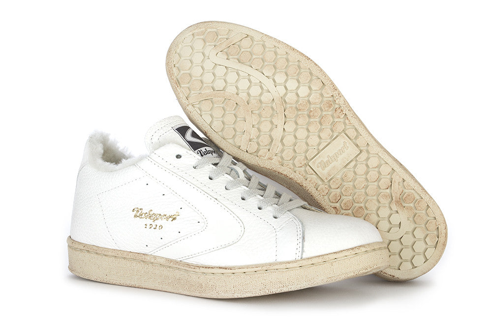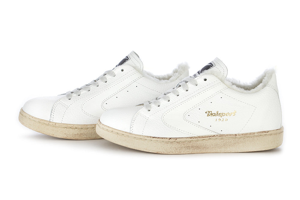 Valsport 1920 - "Tournament" women's sneakers in white hammered leather with inserts in white. Lining is made with natural cotton, faux fur and leather. Handmade in Italy.