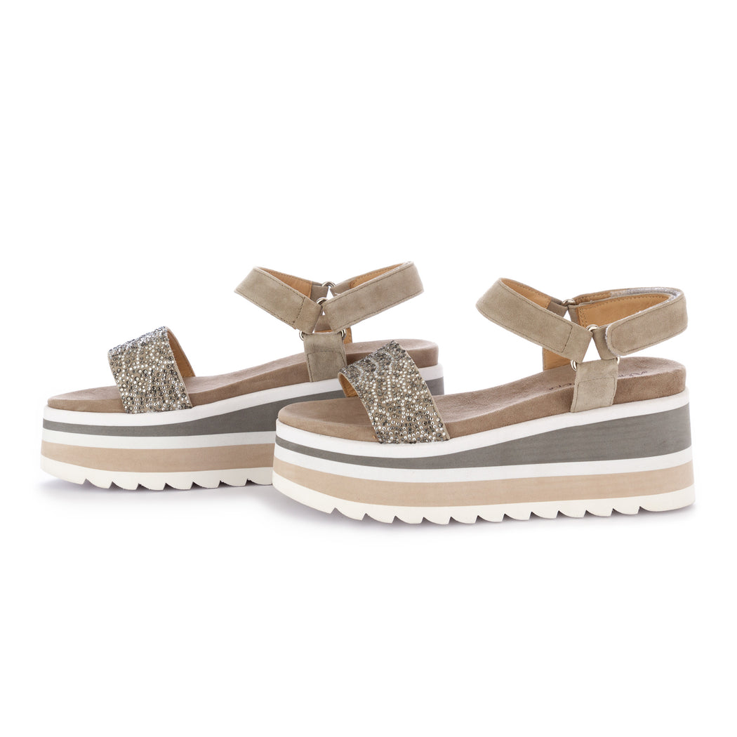 Alma En Pena - Sandalo donna in pelle scamosciata color grigio beige, zeppa in gomma colorata, chiusura con cinturino alla caviglia ed applicazioni di strass. Ecco qui i tuoi sandali, proprio quelli che stai cercando, perfetti in ogni occasione, con abiti o pantaloni, femminili, pratici, comodissimi e super cool!