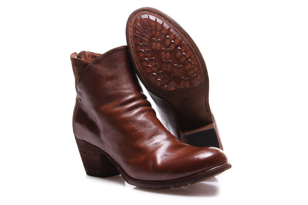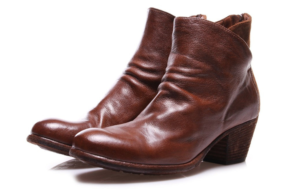 Officine Creative - Stivaletti "Giselle" in pelle marrone con tacco texano e tomaia ad effetto stropicciato. Hanno la chiusura con zip posteriore e la suola in gomma cucita Blake. Classici, belli, comodi, indossali e diventeranno i tuoi preferiti.