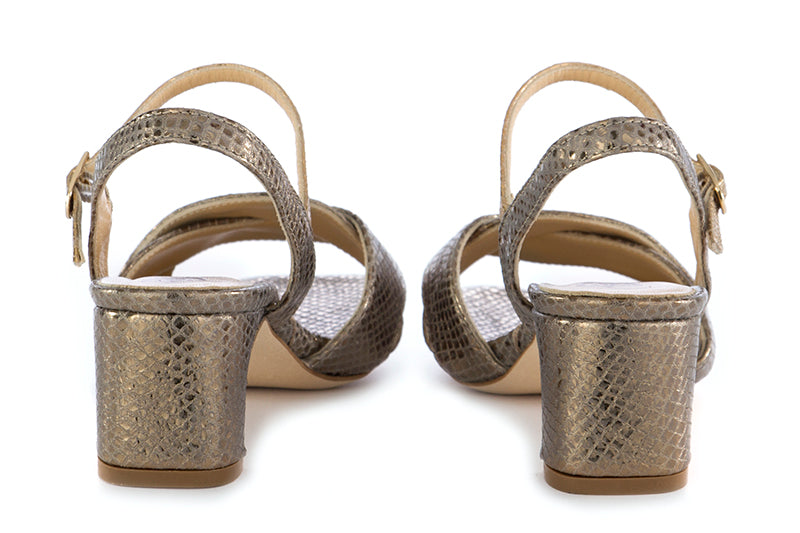 L'Arianna - Grey laminated leather sandals with "snake" print, small square heel and crossed upper. Simple and practical, with a heel that slims the leg and makes everything more feminine. Wear them with dresses, to be chic, with jeans to give your sneakers a day off!