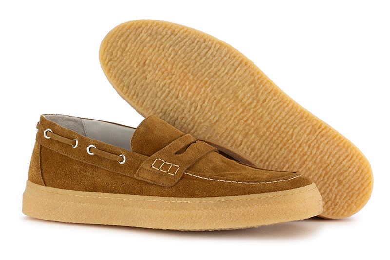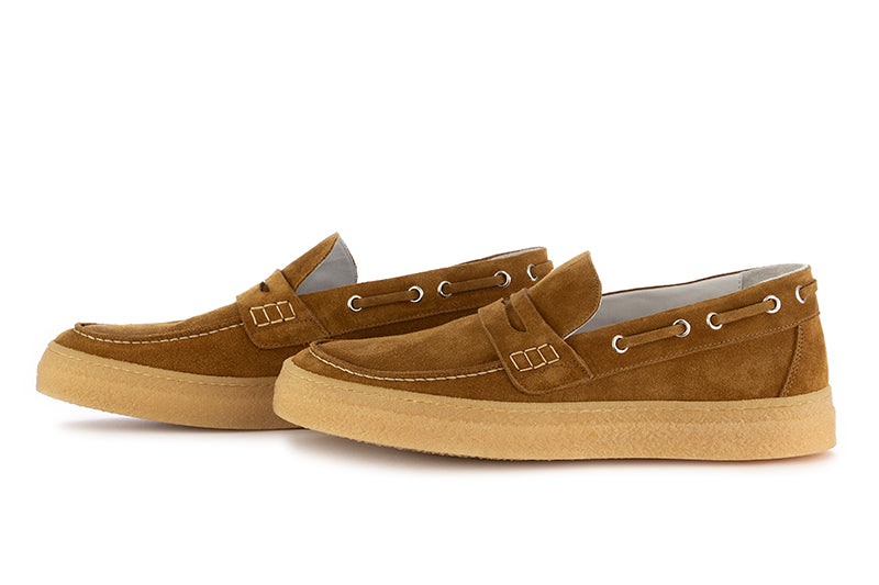 OA Non-Fashion - Khaki suede loafers with a beige rubber sole and removable leather insole. We strongly believe in this company, non-fashion, and quality, timeless and transversal shoes, to walk from morning to evening with respect for the planet.