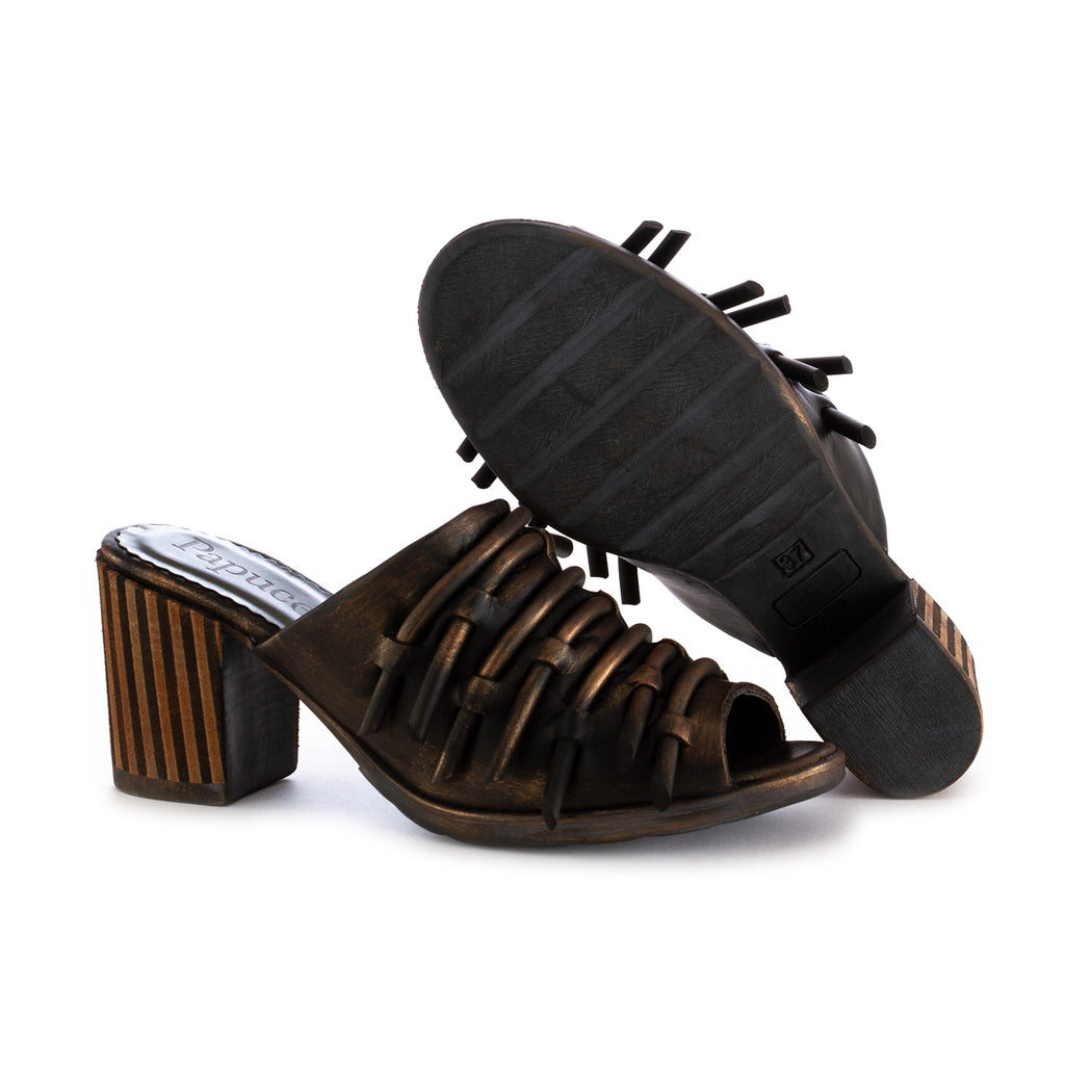 Papucei - Dalinda, beautiful black leather sabots with rubber details and bronze shades, with leather insole and solid heel. Comfortable, light, easy to combine, sandals to take on vacation or to use even in the city or at work, perhaps with a maxi dress.