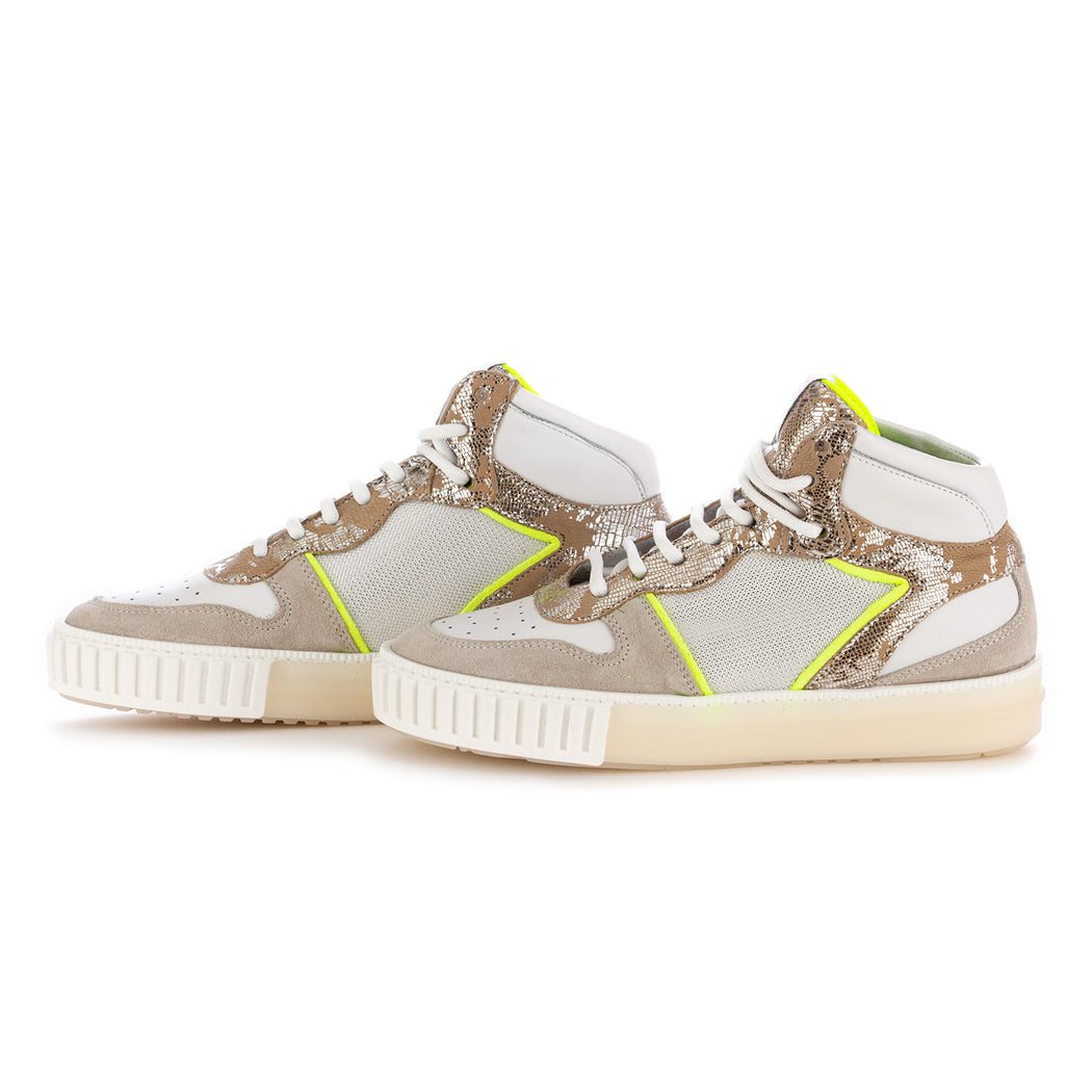 Semerdjian - High ankle sneakers, model SMR 23 in beige-white and fluo yellow leather. Made in Italy. Eccentric, ideal to amaze by creating contrasts, comfortable and versatile because you can dare and combine them with all your outfits, from morning to evening!