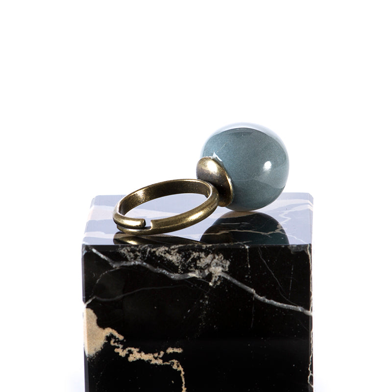 Tolemaide - Ring in antiqued brass, adjustable, with ceramic sphere glazed in blue, handmade in Italy. Its romantic line is delicious, use it to complete your outfits, you will always have a dreamy allure. Wonderfully simple.